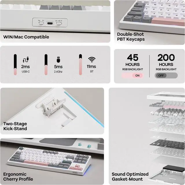 Packed with three modes of connection and an easily accessible mode switch besides the USB port, the TH108 keyboard offers reliable 2.4GHz wireless, low-latency cable mode, and versatile Bluetooth connectivity.