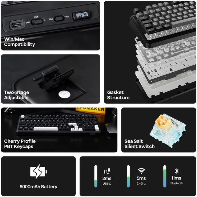 Sound Dampening: 5 layers: Poron Sandwich Pad, IXPE Switch Pad, PET Sound-Enhancement pad, Bottom Poron and Bottom Silicone.