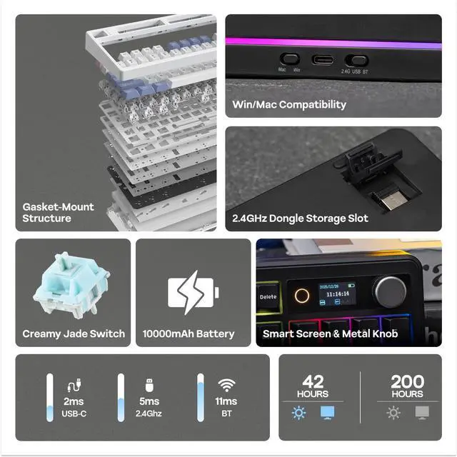 • Gaming Keyboard with 10000mah Battery: Image a workspace where one keyboard rules every screen without the clutter of wires? The TH99 PRO combines reliability and limitless mobility. Equipped with a massive 10,000mAh battery, this tri-mode gaming keyboard offers 150-200 hours of high-performance use on a single charge (RGB OFF). Or, leave the RGB lighting on full blast with 40 plus hours of intense uses including screen display. The versatile connectivity allows seamless switch from a high-stakes competitive match on your PC to responding to a text on your Android phone, and then jump straight into a creative project on your Mac laptop with just a quick shortcut.
