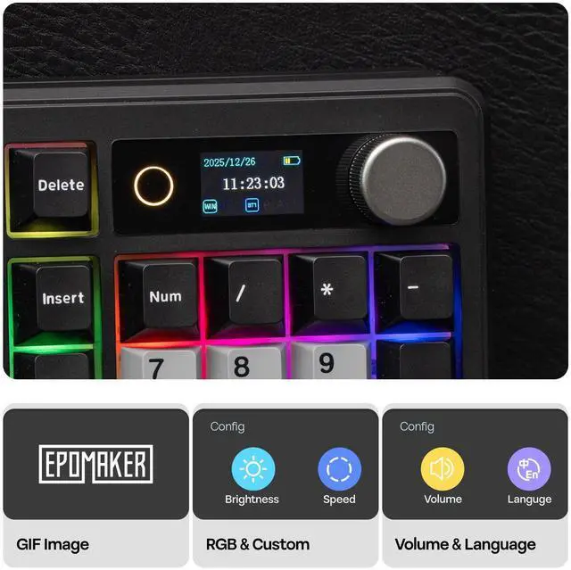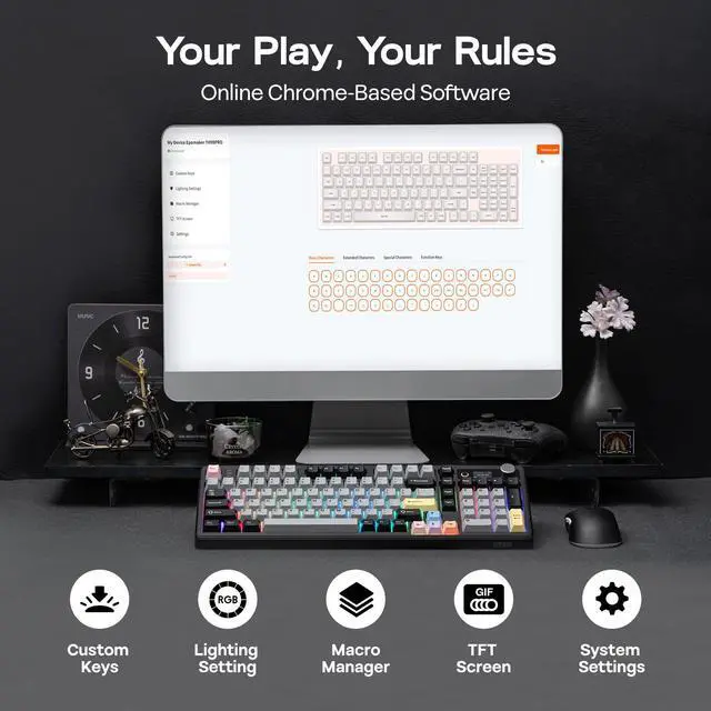 • PRO with Screen, Functional Design: Experience the EPOMAKER TH99 PRO custom keyboard, the fully programmable extension of your workflow and playstyle. The precision-engineered volume knob provides instant auditory control, allowing mid-game toggle without ever alt-tabbing; while the stunning glass screen, with Infor page for keyboard status, battery and time monitor, serves as your digital command center with GIF display and RGB control panel. The Chrome-based software, available online and offline, empowers you to remap every key and record complex macros to automate repetitive Excel strings or multi-hit game combo with a single tap.