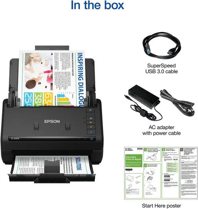 ES-400 II document scanner, Start Here poster, SuperSpeed USB cable, AC adapter and power cable