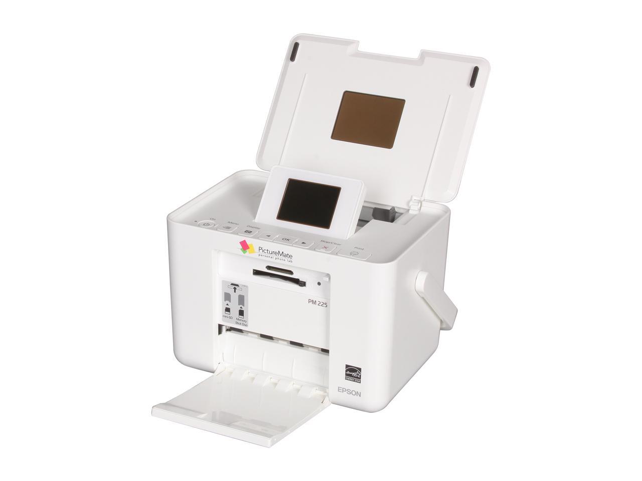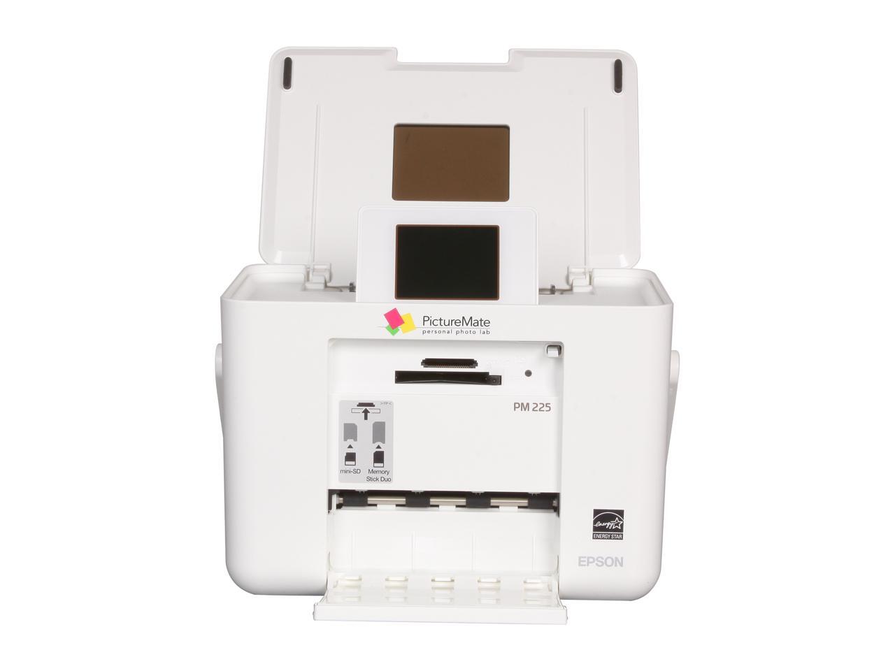 EPSON PictureMate 225 4" x 6" photo in as fast as 37 seconds Black Print Speed 5760 x 1440 dpi Color Print Quality USB InkJet Photo Color Printer