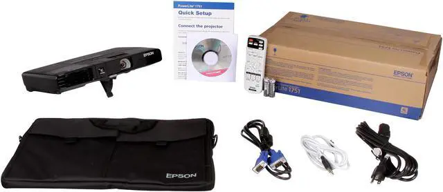 PowerLite 1751 projector Power cable Computer cable (VGA) Projector remote control with batteries USB cable Soft carrying case User manual CD EasyMP software CD Quick setup sheet PrivateLine support card Password protection sticker Security screw
