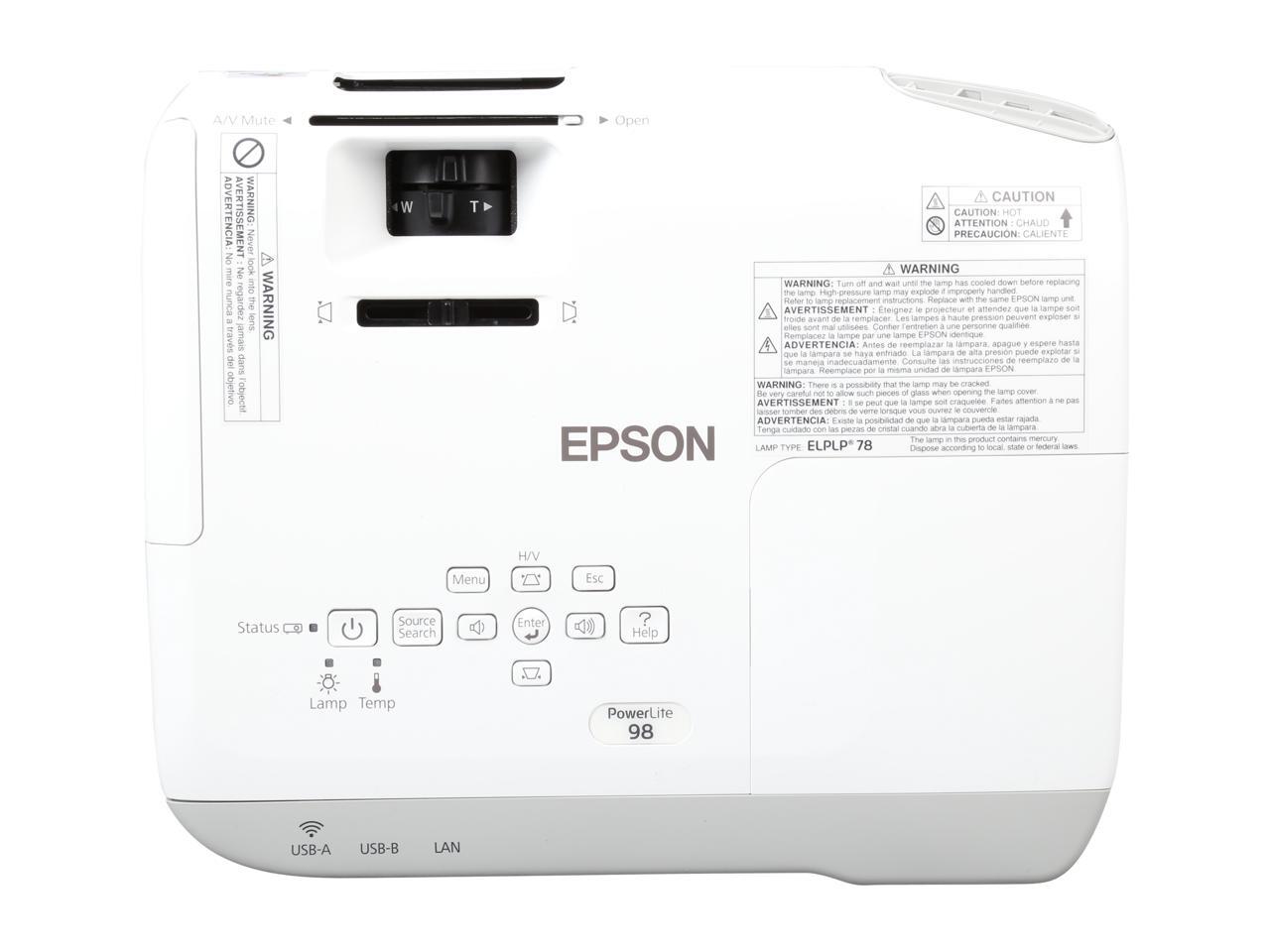 Epson PowerLite 98 1024x768 XGA 3000 ANSI Lumens, RJ45 (Crestron LAN Control/Display), Present up to 4 device screens, HDMI / VGA Input, Kensington Lock, Auto Keystone Correction, 3LCD Projector