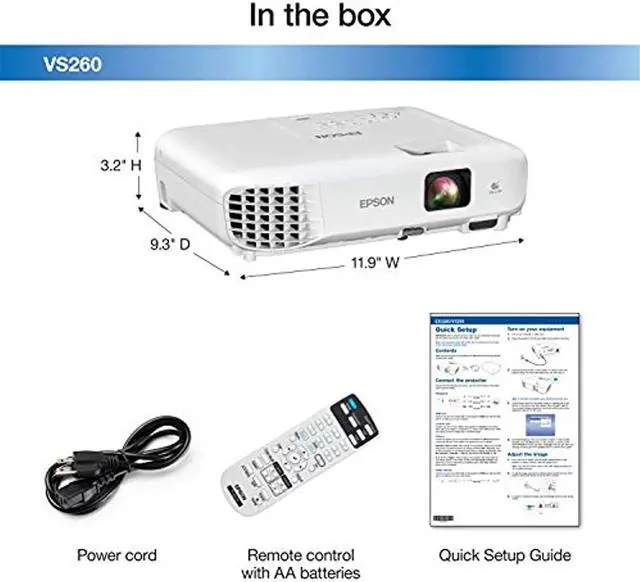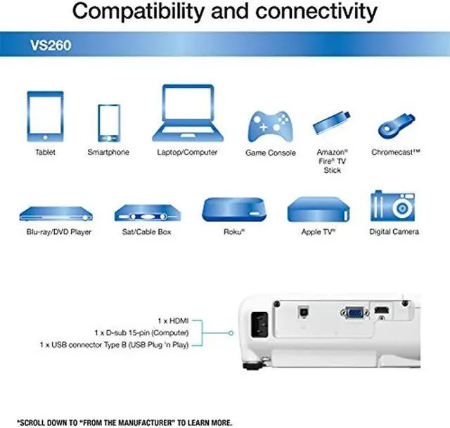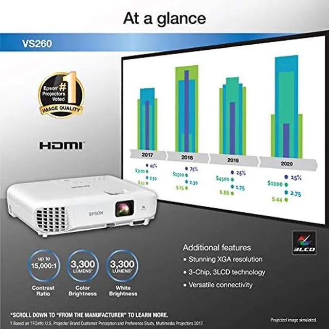 Impress your audience and own the room with the portable VS260 projector, offering 3,300 lumens of color and white brightness1 to deliver crisp, detailed presentations, spreadsheets and videos - even in well-lit spaces. From home offices to video conference rooms, this sleek, compact projector makes it easy to display captivating, big-screen images from nearly any location, using advanced 3-chip 3LCD technology and crisp XGA resolution. Perfect for creating dynamic, engaging presentations, the VS260 allows for easy Zoom video conferencing, accepts 4K content and conveniently connects to streaming devices, such as Fire TV, Apple TV®, Roku, and Chromecast™, through the HDMI port® to support a variety of rich content, including movies, TV shows and more.