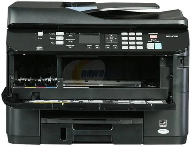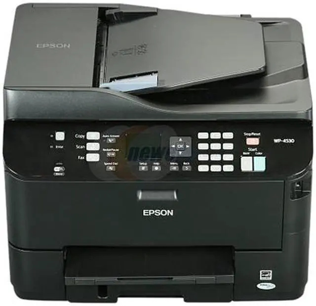 At twice the speed of inkjets and featuring the World's Fastest auto two-sided print speeds, plus automatic two-sided copying / scanning / faxing, the WorkForce Pro WP-4530 delivers professional quality output while getting up to 50% lower printing costs vs. color laser. Boasting two-sided print speeds of 9.2 ISO ppm (black) and 7.1 ISO ppm (color), this ultra efficient all-in-one printer moves at your busy pace. Offering remarkable productivity, it features a 330-sheet paper capacity and a 20,000-page duty cycle. Use the 30-page two-sided Auto Document Feeder to quickly copy, scan or fax one- or two-sided documents. Best of all, the WP-4530 offers low hassle, extra large, easy to install cartridges, with a high-yield of 2400 pages Black, 1200 pages color. Built-in wireless networking makes it easy to share your all-in-one printer with others. And, direct mobile printing ensures you'll be able to print and scan from virtually any room.