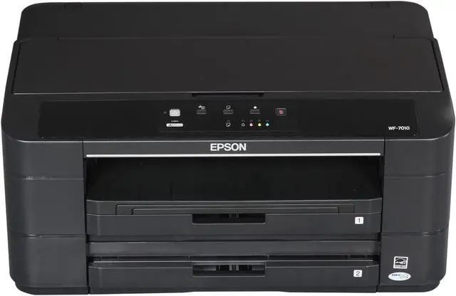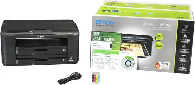 WorkForce WF-7010 inkjet printer, instruction booklets, free sample paper pack, CD-ROM with drivers, power cord, Four 126-series High-capacity ink cartridges – Black, Cyan, Magenta, Yellow