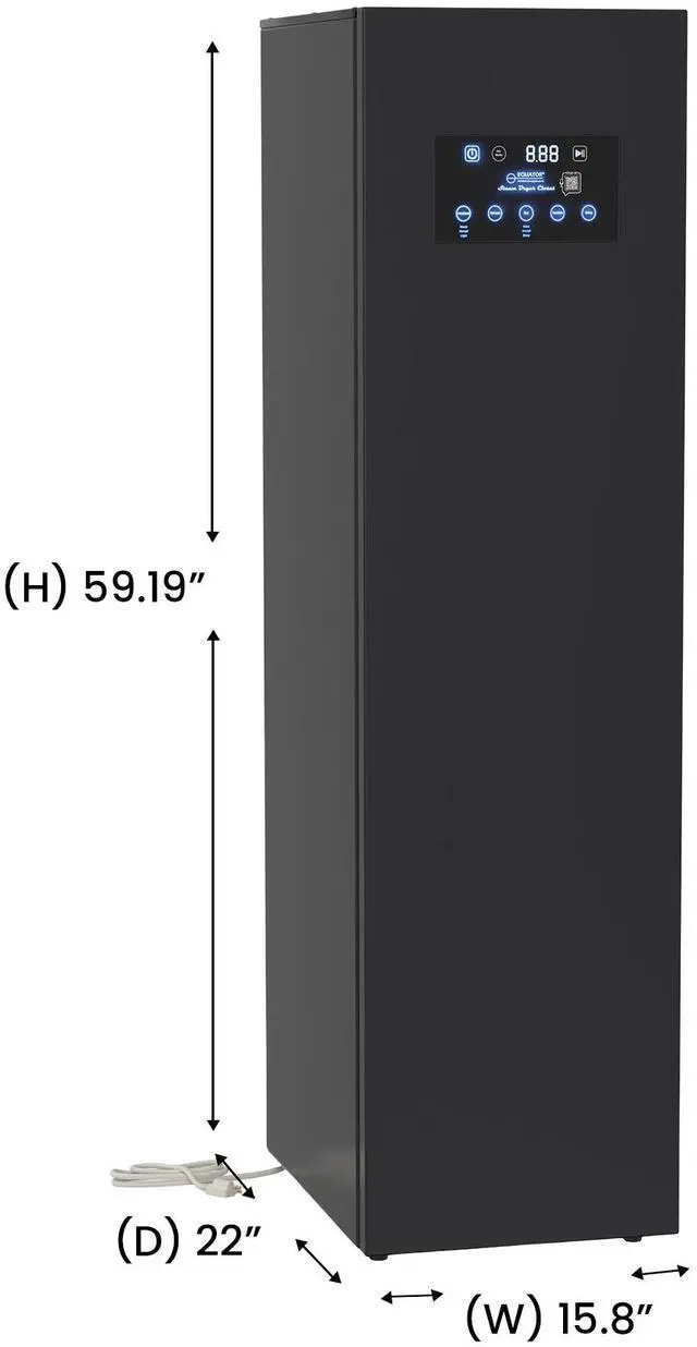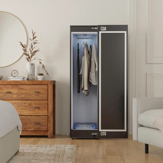 The drying cabinet also sanitizes and deodorizes clothes with an interior UV light, keeping your daily clothes, ethnic wear, and business casuals feeling fresh. Use its perfume fill container to infuse your clothes with your favorite scent while they dry. The 59^316" x 22" x 15^1316" (HxWxD) dryer boasts a slim design and four adjustable legs for secure placement in your bedroom or laundry room. Its ultra-quiet operation lets you steam clean clothes at night without disturbing your family's sleep. Plus an auto-cooling function and dehumidifer ensures your clothes are ready to wear without excess steam upon opening the door.