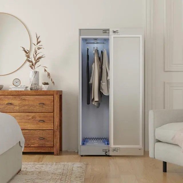 The drying cabinet also sanitizes and deodorizes clothes with an interior UV light, keeping your daily clothes, ethnic wear, and business casuals feeling fresh. Use its perfume fill container to infuse your clothes with your favorite scent while they dry. The 59^316" x 22" x 15^1316" (HxWxD) dryer boasts a slim design and four adjustable legs for secure placement in your bedroom or laundry room. Its ultra-quiet operation lets you steam clean clothes at night without disturbing your family's sleep. Plus an auto-cooling function and dehumidifer ensures your clothes are ready to wear without excess steam upon opening the door.