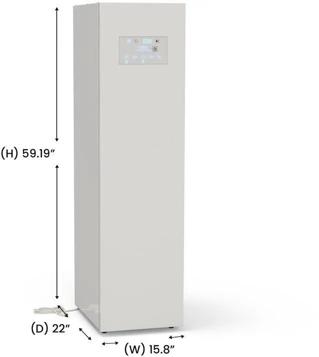 The drying cabinet also sanitizes and deodorizes clothes with an interior UV light, keeping your daily clothes, ethnic wear, and business casuals feeling fresh. Use its perfume fill container to infuse your clothes with your favorite scent while they dry. The 59^316" x 22" x 15^1316" (HxWxD) dryer boasts a slim design and four adjustable legs for secure placement in your bedroom or laundry room. Its ultra-quiet operation lets you steam clean clothes at night without disturbing your family's sleep. Plus an auto-cooling function and dehumidifer ensures your clothes are ready to wear without excess steam upon opening the door.