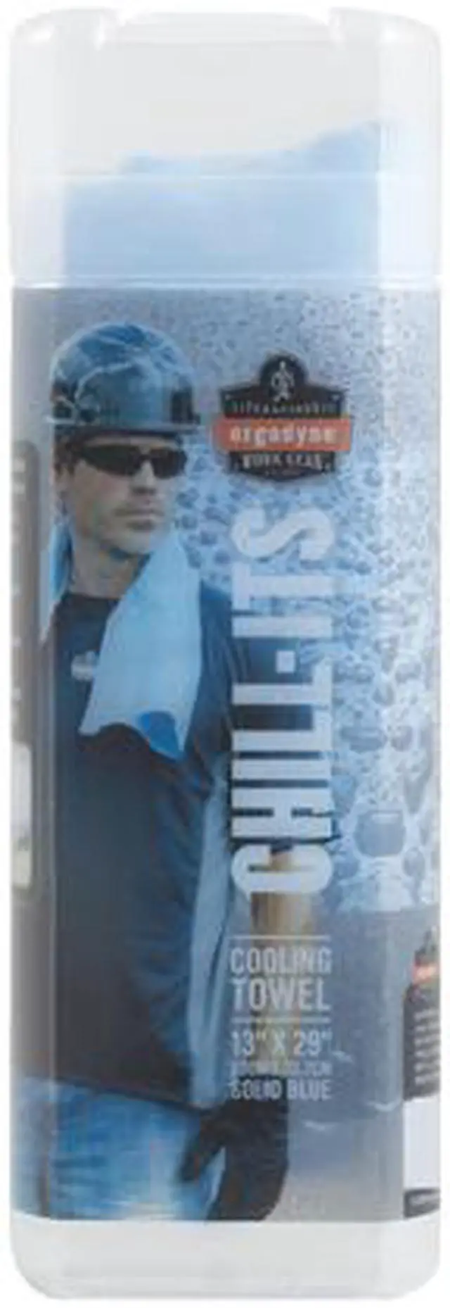 Evaporative Cooling Towel, Material PVA, Color Blue, Cooling Method Evaporation, Maximum Cooling Time Up to 4 hours, Overall Length 29 1/2 in, Overall Width 13 in, Pattern Solid, Cleaning and Care Instructions Machine Wash, Container Type Bag, Features Heat Stress Prevention, Instant Cooling Relief, Includes Storage Container Yes, Size Universal, Soaking Time 1 min, Wet/Dry Use Wet