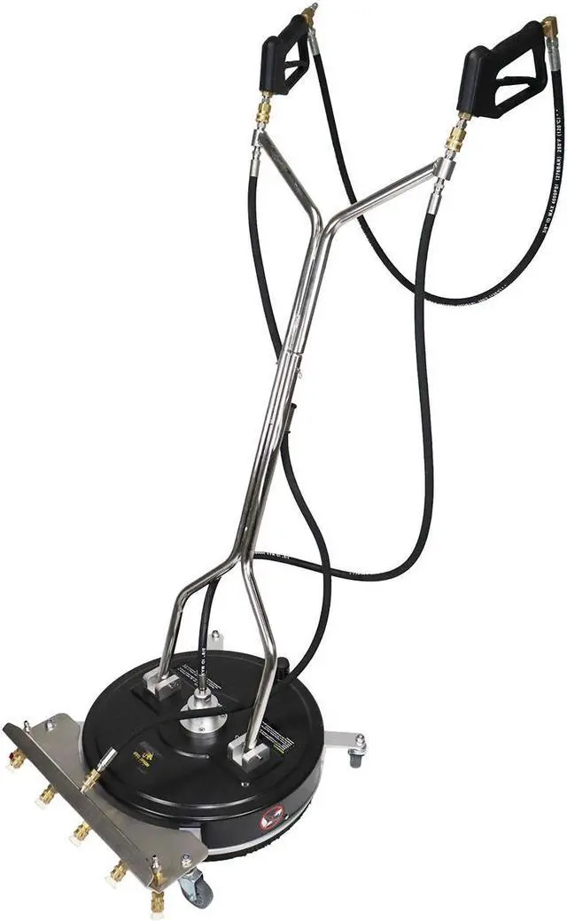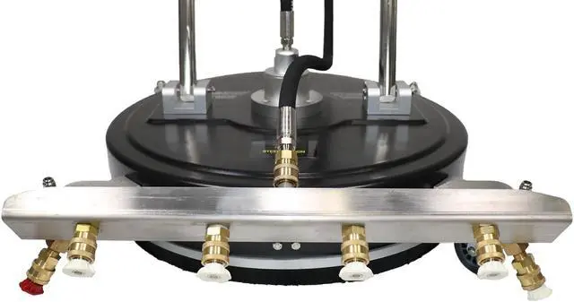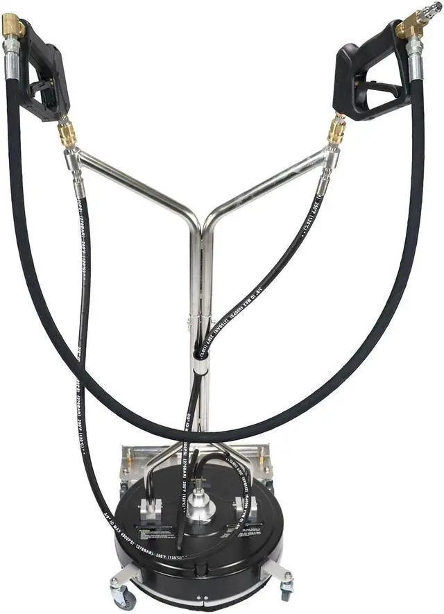 This is a high-capacity surface cleaner and requires a gas or electric powered pressure washer that can supply the needed volume of water. Use a pressure washer ranging with a minimum of 2 GPM @ 2000 PSI to 4 GPM @ 4000 PSI. Two pressure washers are required to use the rotating surface cleaner and the front spray nozzles at the same time.