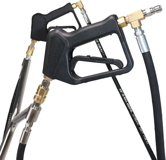 This surface cleaner has a maximum water temperature of 210° F, making it ideal for hot or cold water applications. Rotating spray bar has two (2) nozzles. Trigger guns have 3/8-inch Quick Connect inlet male plug for connecting the pressure washer hose.