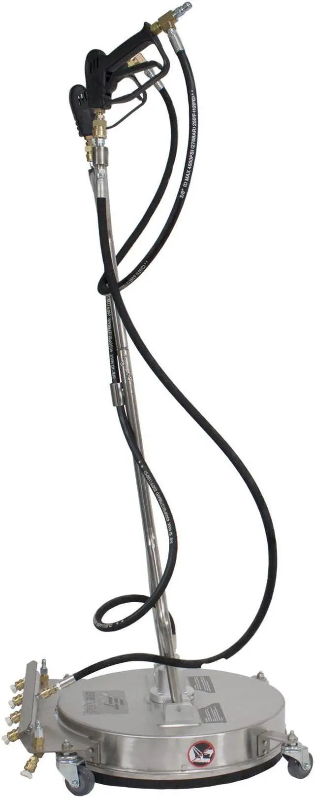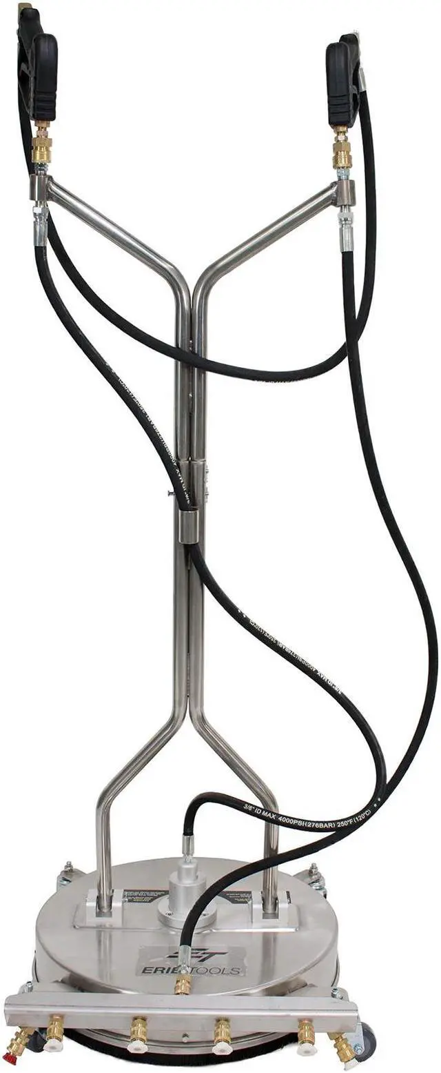 Erie Tools 21-inch Stainless Steel Surface cleaner with front spray bar and handle with dual trigger gun is designed to clean large surfaces as well as hard-to-remove stains. This surface cleaner will easily remove dirt and grime in three ways; rotating spray bar, front water broom spray bar, or spot cleaning, 0°, and 40° spray nozzles.