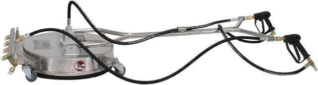 This is a high-capacity surface cleaner and requires a gas or electric-powered pressure washer that can supply the needed volume of water. Use a pressure washer ranging with a minimum of 2 GPM @ 1250 PSI to 4 GPM @ 4000 PSI. Two pressure washers are required to use the rotating surface cleaner and the spray nozzles at the same time.