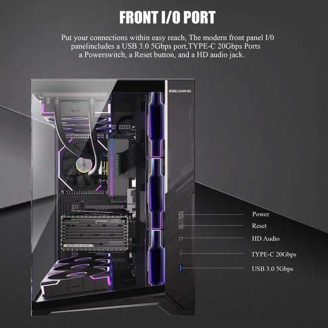 - Front I/O Panel - Put your connections within easy reach, The modern front panel I/0 panelincludes a USB 3.0 5Gbps port,TYPE-C 20Gbps Ports,a Powerswitch, a Reset button,and a HD audio jack.