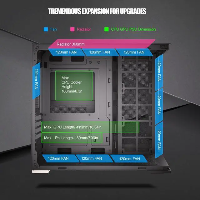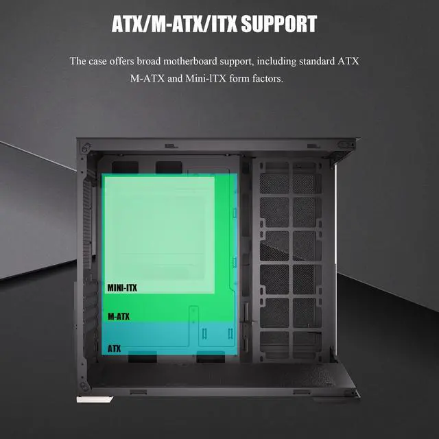 - Motherboard Compatibility - Compatible with ATX, Micro-ATX, and Mini-ITX motherboards. Support GPU up to 415mm, CPU cooling height up to 160mm, support top mounting up to 360mm liquid cooler, support PSU up to 180mm