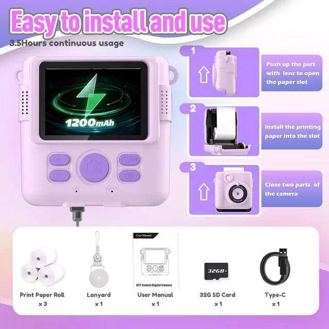 Instant Print Camera for Kids, Christmas Birthday Gifts for Girls Boys Age 3-12,Kids Digital Cameras for Toddler, Portable Toy for 3 4 5 6 7 8 9 10 Year Old Girl with 32GB SD Card-Purple