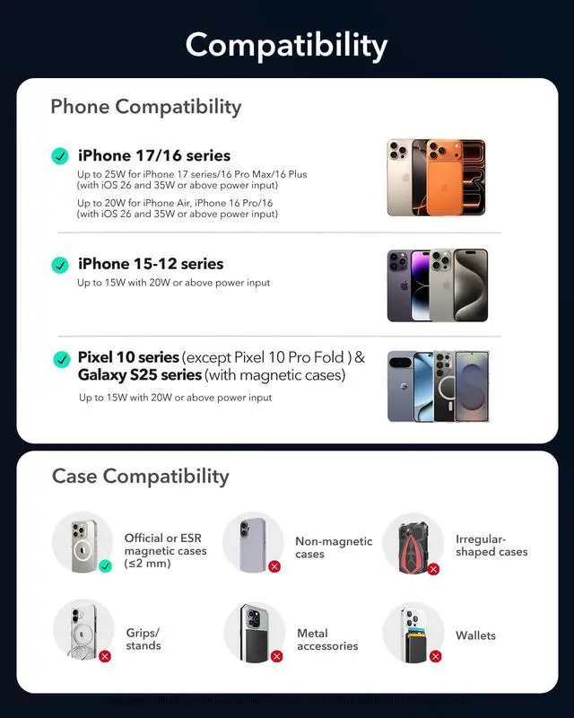| Compatible Phone Models | Qi2.2 25W for iPhone 17, iPhone 17 Pro, iPhone 17 Pro Max, iPhone 16 Plus, iPhone 16 Pro Max(with IOS 26 or Later); Qi2.2 20W for iPhone 17 Air, iPhone 16, iPhone 16 Pro; Qi2 15W for iPhone 15, iPhone 15 Plus, iPhone 15 Pro, iPhone 15 Pro Max, iPhone 14, iPhone 14 Plus, iPhone 14 Pro, iPhone 14 Pro Max, iPhone 13, iPhone 13 Pro, iPhone 13 Pro Max, iPhone 12, iPhone 12 Pro, iPhone 12 Pro Max, Google Pixel 10, Google Pixel 10 Pro, Google Pixel 10 Pro XL, Samsung Galaxy S25 Ultra/S25 +/S25 with a magnetic case |