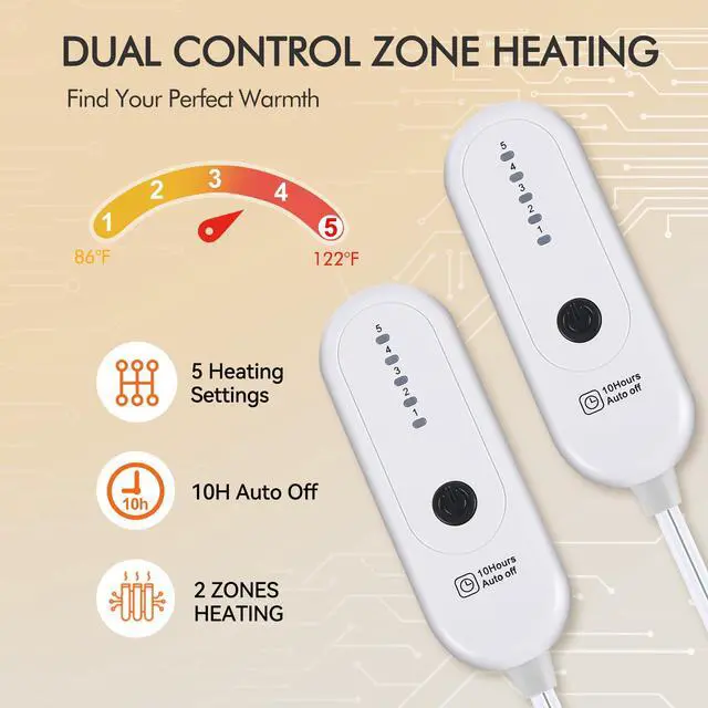 Smart Dual Control & Overheat Protection: Our heating blanket queen has dual controllers, allowing partners to choose their own exclusive temperature. The 10-hour automatic shutdown and overheat protection function makes you feel more at ease when you use it. 5 heating settings, the temperature can be adjusted freely.