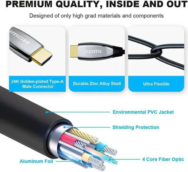 Ultra Durable & Flexible: Our 8K HDMI fiber cables are constructed with high speed, 24K golden-plated Type-A connectors, bare copper conductors, durable and environmental PVC jacket to minimizes signal interference and to ensure longer lifespan. It was tested plug and unplug for 10,000+ times, with its triple shielding it can withstand more than 6,000+ 90 degree bends lifespan. It is 10X durable than other HDMI optic cable on the market.