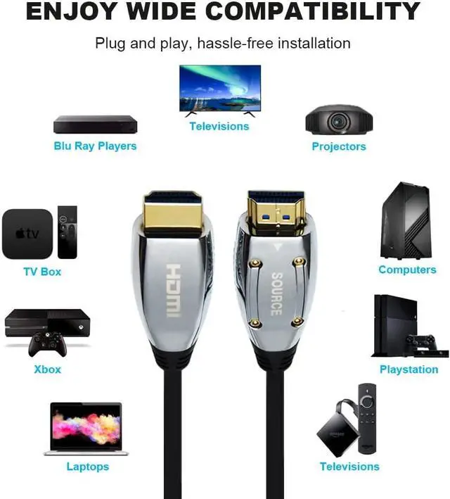 Real 8K HDMI Fiber Optic Cable: Our latest 8K HDMI 2.1 fiber optic cable supports maximum video resolutions of 8K@60Hz and 4K@120Hz. It also downwards compatible HDMI 2.0, 1.4 and 1.3. Featuring 100% Real 8K quality, each cable is individually tested to supports the highest standard of 8K HDMI 2.1 standards. You will be amazed at how this 8K HDMI cable show you stunning image and audio without any loss and latency.