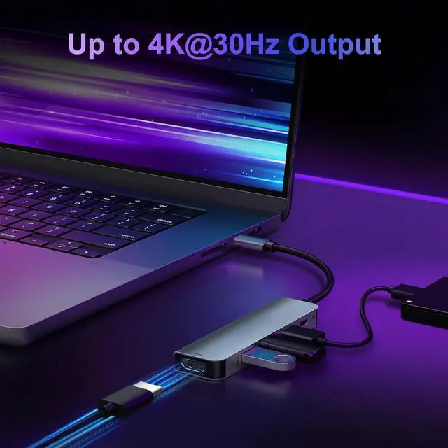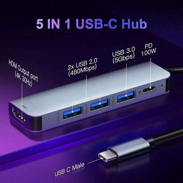 5-in-1 USB C Hub: This USB C Splitter 1 to 5 features 1*4K HDMI port, 1 *USB 3.0 port, 1*100W PD charging port, and 2*USB 2.0 ports. This USB C splitter almost meets all daily work needs, efficient and convenient, plug and play, without the need to install any drivers.