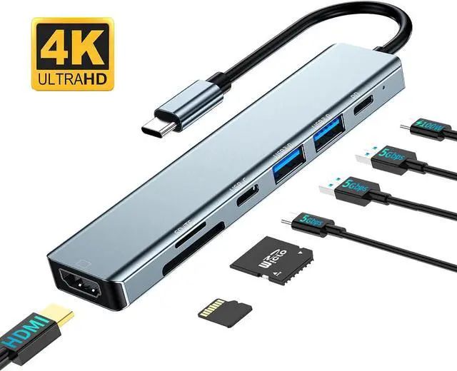 • [7-in-1 USB-C Hub] USB Hub with 1* 4K HDM port, 1*100W Power Delivery (PD) port, 1* USB-C and 2*USB 3.0 5Gbps data ports, 1*MicroSD card slot, and 1*SD card slot, multiport connectivity to satisfy all your expansion needs, and provide your work efficiency at home ,in the office or on the go.