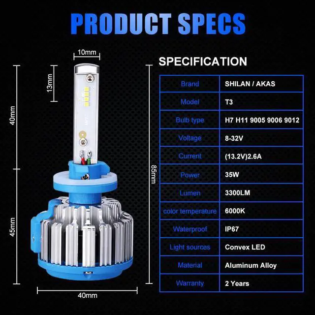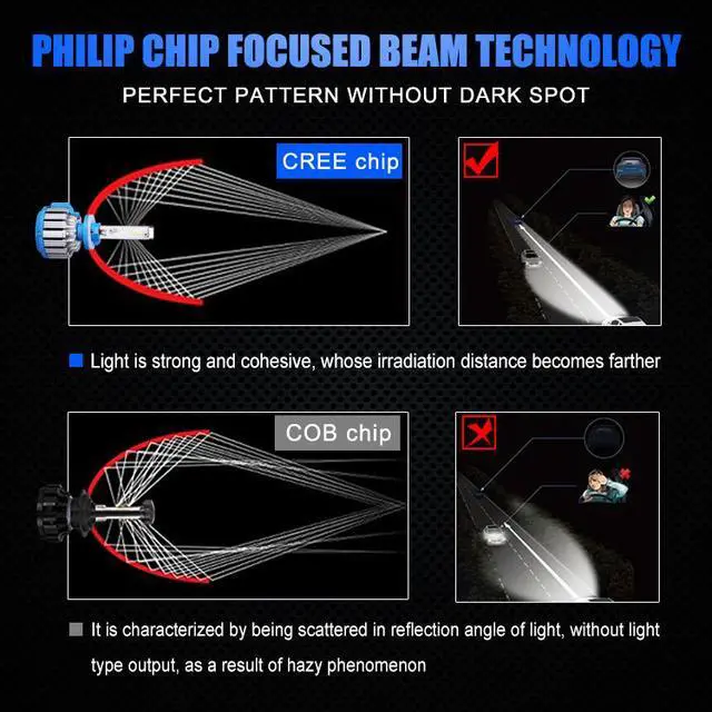Powerful LEDs provide 7200 lumens(3600LM per bulb)output, producing bright light for increased visual field and distance visibility in darkness and gloom.