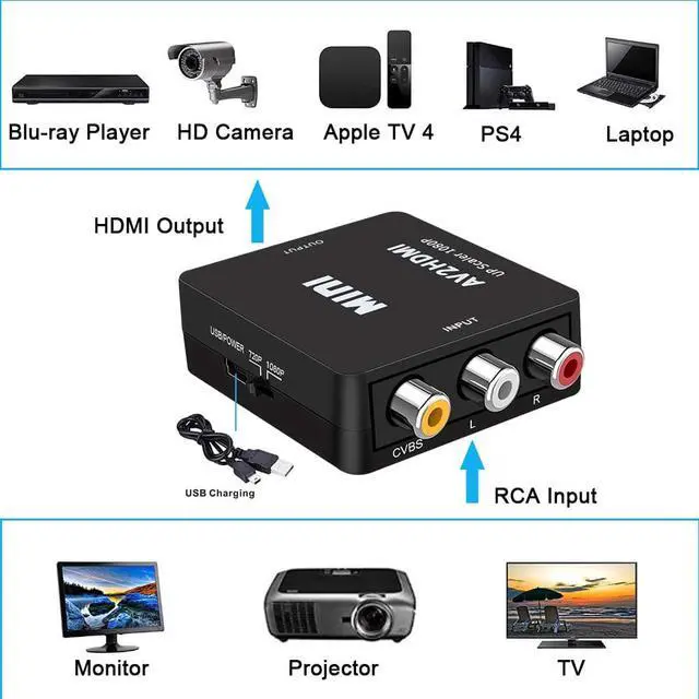 RCA to HDMI Adapter: Sending signal hosts device should have composite Video (Yellow, White, Red) Output, such as PS3/HD Player ( RCA); Receiving signal device should have HDMI Input, such as TV / Monitor. Support HDMI 1080p or 720p output.