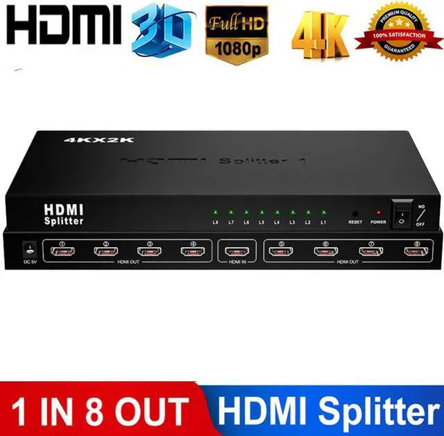 HDMI Splitter amplifies and distributes the HDMI input signal into eight identical, synchronized outputs. The splitter also has the ability of buffering and amplifying to achieve longer transmission distance of HDMI signal. Compatible with HDTVs, projectors, PC monitors, as well as various HDMI source devices including PC, cable/satellite receiver, Blu-ray DVD player, PS 3/4, Xbox, Chromecast, Amazon Fire TV etc., this splitter is suitable for home theater and other dual display applications such as data center control, information distribution, conference room presentation, school and corporate training environment.