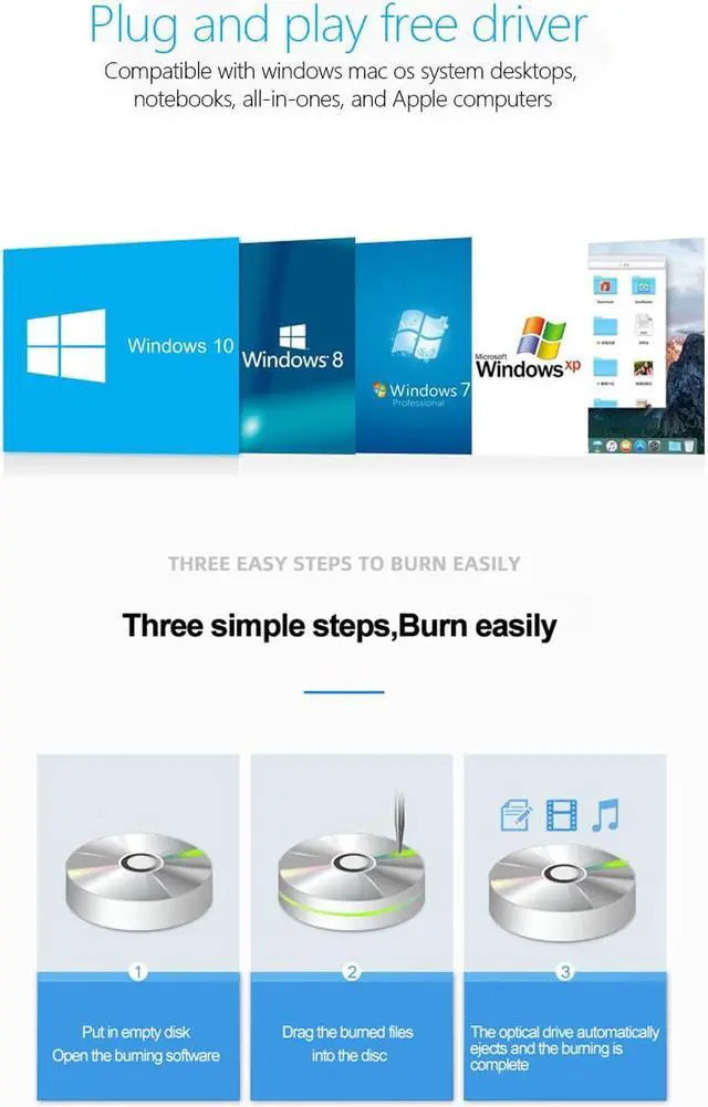 External CD/DVD drive for laptops, desktop computers Linux OS, Apple Mac MacBook Pro CD burners are compatible with all versions of Mac OS from Windows XP/Vista/7/8 1/10 Linux. For Desktop computer, this CD USB drive should be connected to the motherboard USB port