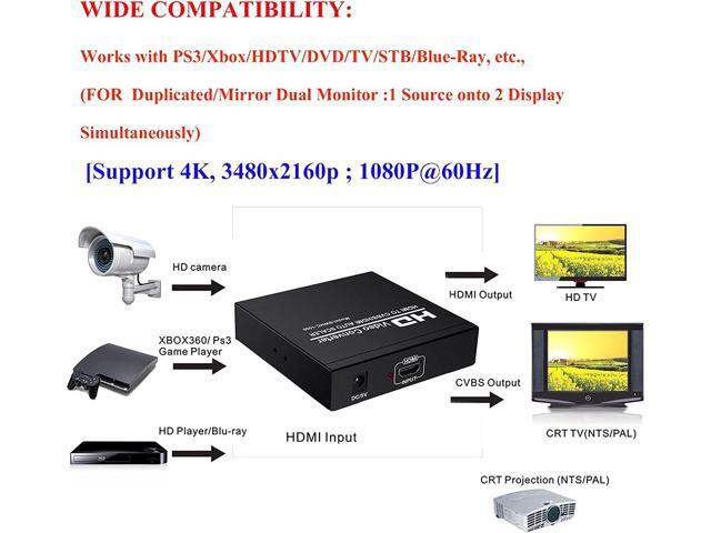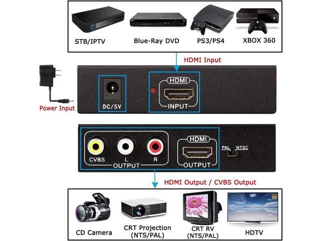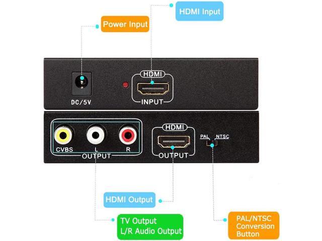 - This HDMI to RCA hdmi to hdmi Adapter,Video Converters and HDMI Adapter Converter,hdmi to rca coverter, can distribute 1 HDMI input signal to HDMI Output + CVBS composite video signal and L/R stereo audio Output , transmit video and audio simultaneously, no loss, no lag .(Come with a 5V1A Power adapter).