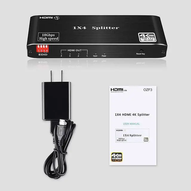 • HDMI Splitter 1 in 4 Out,4K@60HZ HDMI Splitter 1 Port to 4 Display Duplicate/Mirror,1x4 HDMI Monitor Splitter HDMI 2.0,HDCP2.2,EDID,18Gbps,3D,HDR