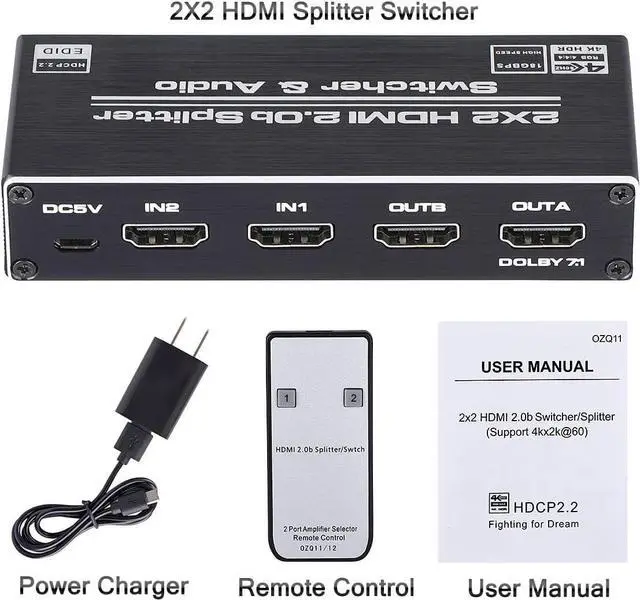 What you Get: 1 x HDMI Switch Splitter 2 in 2 out, 1 x IR Remote, Control, 1 x Power Adapter, 1 x User Manual. ESTONE ensures long-time satisfaction of your purchase: Friendly and easy-to-reach customer service to solve your problems timely. If you have any problems, Please contact us we will slove immediately.