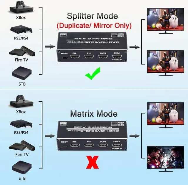 HDMI Switch 2x2: This 2 in 2 Out HDMI switch splitter easily streams video and audio from 2 HDMI devices to 2 HDMI display simultaneously. And it can amplify your HDMI signals at the same time. This two singal sources can be switched freely via button or remote control. (Note: At Split Mode Only Supports Duplicate/Mirror Screen Monitor, Do not support Extend Mode.)