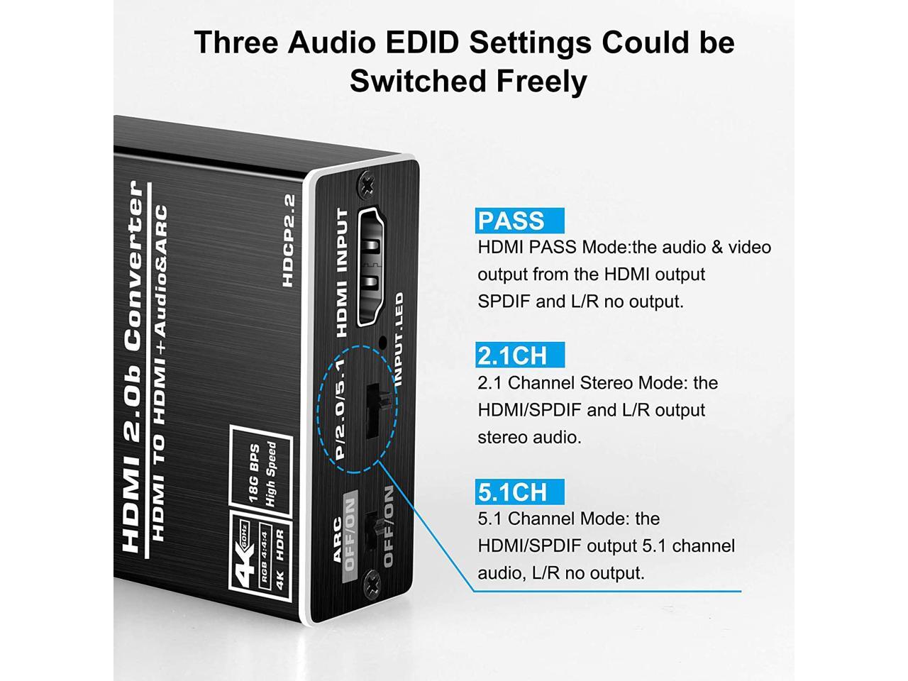 One HDMI Input to one HDMI Output(Pass Mode), Toslink SPDIF (Optical) digital audio output(2.0CH/5.1CH Mode), and 3.5mm stereo audio output(2CH Mode), achieving the synchronization of audio signal separation, guarantees audio and video transmission with high-fidelity and lossless