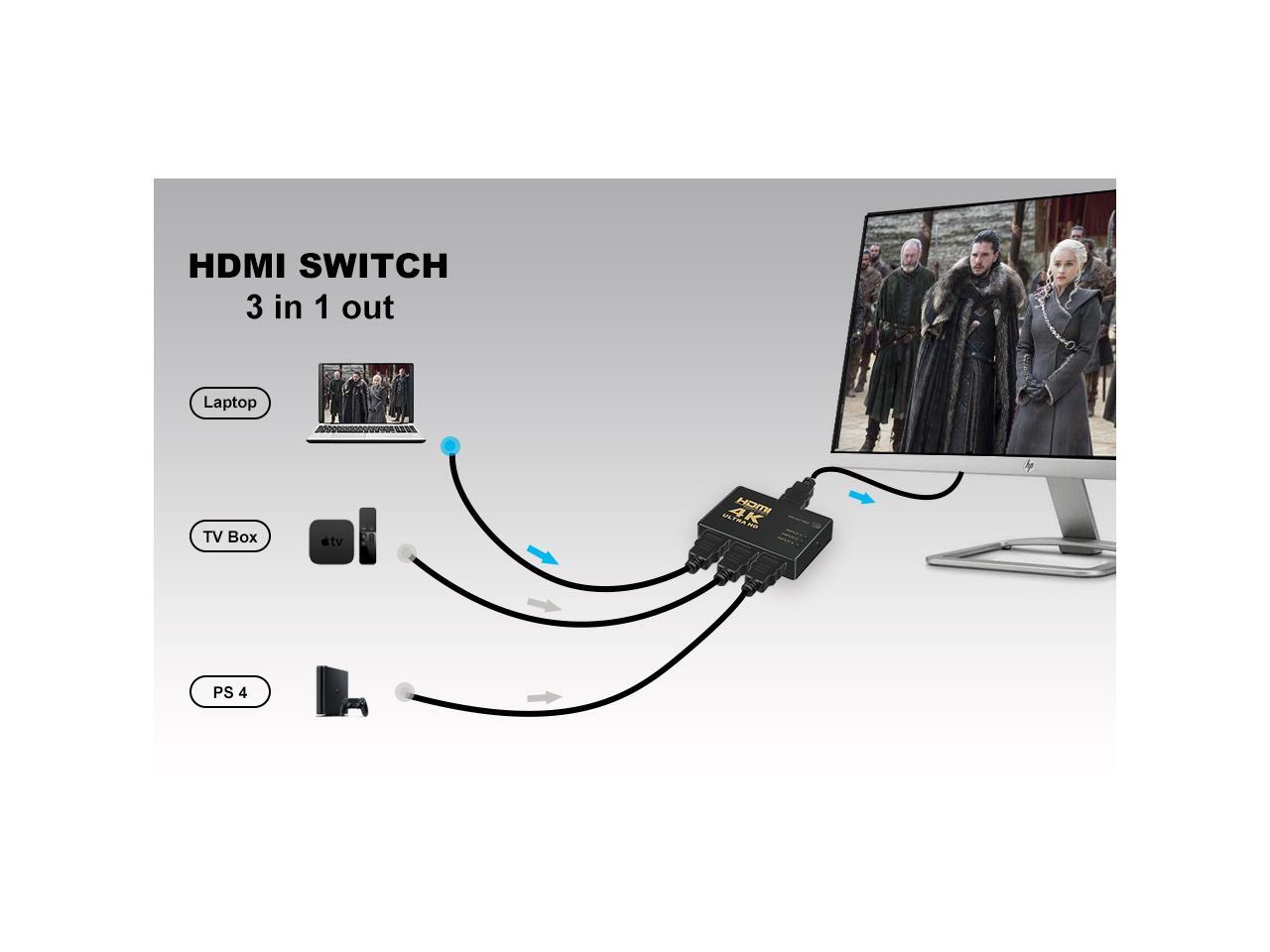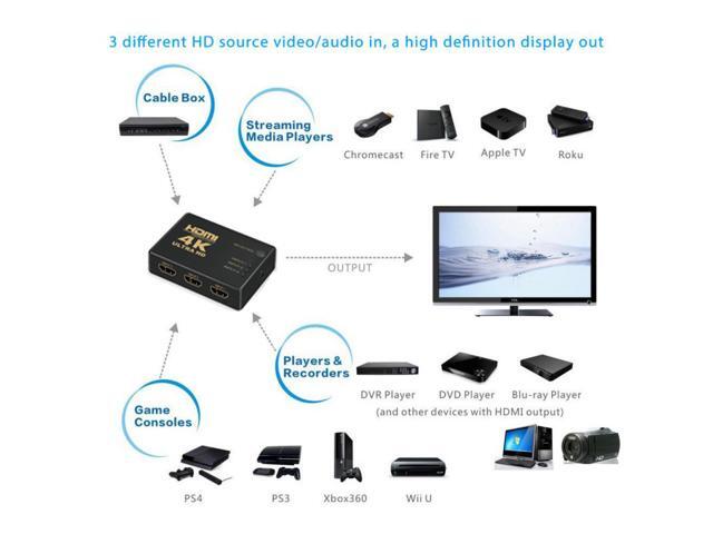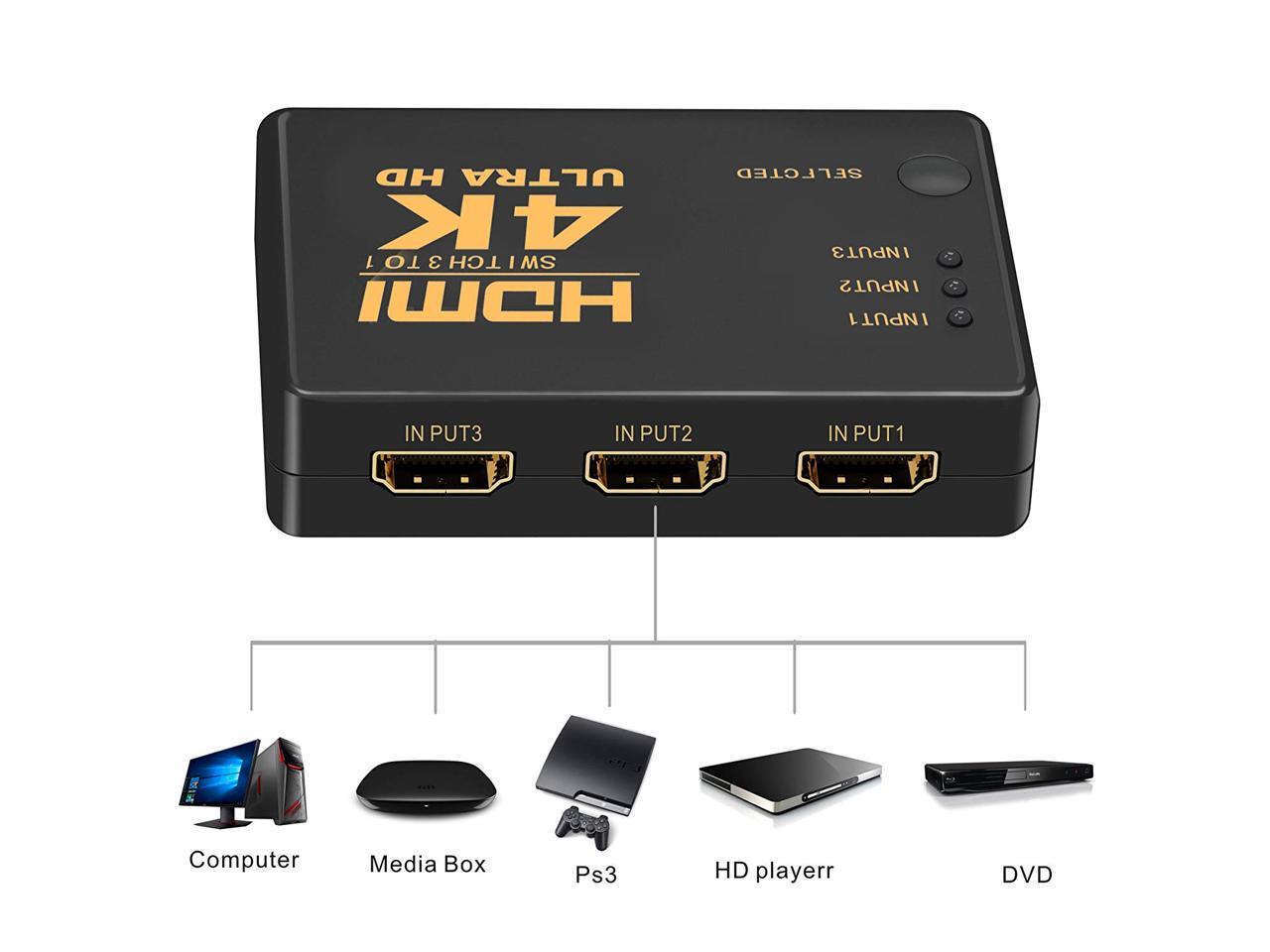 HDMI Switcher 3 in 1 Out HDMI Switch 3 Port Box with IR Remote Control Support 4K @30Hz, HDCP 1.4 deep Color and 3D for PS4 Xbox Apple TV Fire Stick Blu-Ray Player