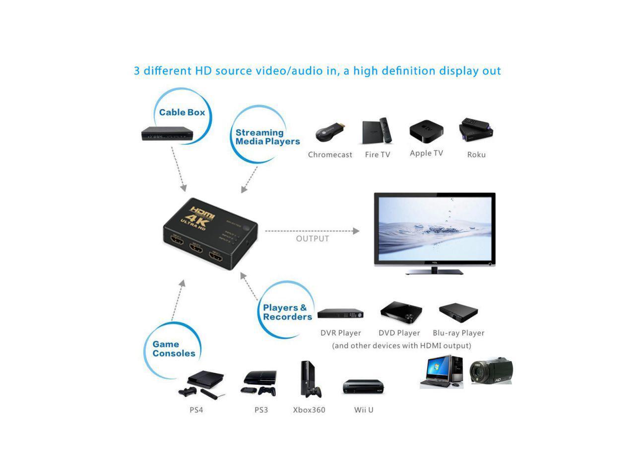 - with 5V power port and USB power cable(included), GANA HDMI switches are compatible with Nintendo Switch, blue-ray, PS4, PS3, Xbox, HD-DVD, sky-stb, XBO360 and most of the other Audio and video devices