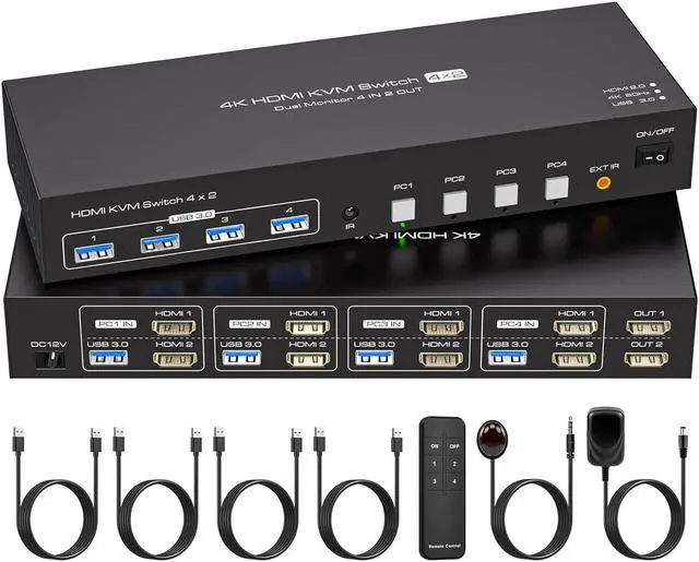 - KVM Switch 2 Monitors 4 Computers: The kvm switches 2 monitors 4 computers allows 4 computers to share 2 displays and 4 USB 3.0 devices, such as a mouse, keyboard, printer, etc. Easily switch between the 4 computers using the remote control or switch buttons on the panel. Supports screen duplication and extension. Duplication mode: Outputs the same image on 2 displays. Extension mode: Outputs different images on 2 displays. Note: Each computer must have 2 HDMI ports