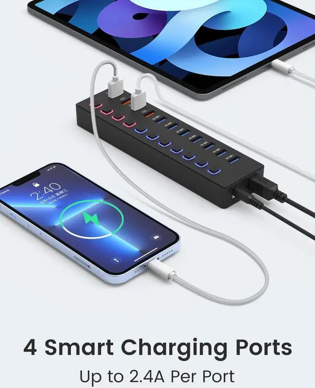 This 11 port powered usb hub 3.0 expands 7 data transfer ports and 4 smart charging ports, is specially designed for charging and data transmission, which can charge and transmit data faster.