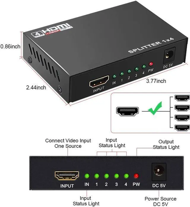 1x4 hdmi splitter with 1 input ports and 4 output ports, can distribute one signal source to 4 hdmi displays or 4 separate HDTVs simultaneously without any loss in quality.
