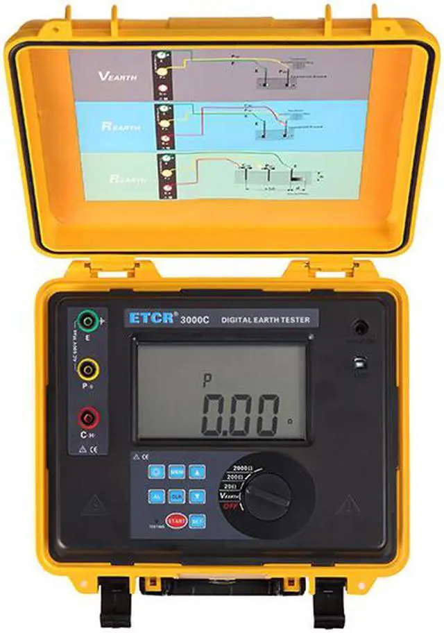 ETCR3000C Digital Earth Resistance Tester specially designed and manufactured for the field measurement of ground resistance, adopts digital and micro-processing technology, 3 wire or 2 wire method to measure ground resistance, with unique calibration function for wire resistance, anti-interference ability and environmental adaptability, to ensure the long-term measurement of high precision, high stability and reliability; The instrument out shell adopts waterproof protection case, anti-collision, anti-fall, waterproof (protection grade IP65),which is strong, safe and durable, the instrument is also equipped with large capacity rechargeable lithium battery pack, especially suitable for outdoor construction site to use.It is widely used in measuring ground resistance of electric power, telecommunication, meteorology, oil field, construction, lightning protection and industrial electrical equipment.