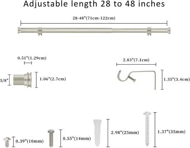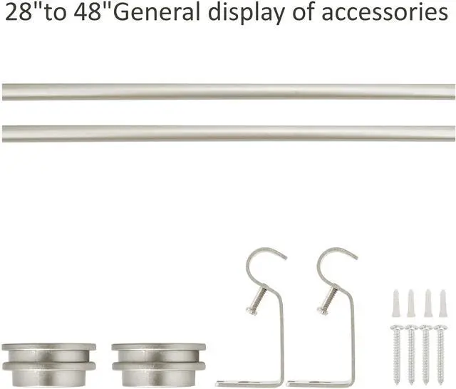 2. The front adjustable curtain rod measures 5/8" diameter and comes with Nerveux finials; the back adjustable curtain rod measures 1/2" diameter and comes with our exclusive design finials. Both rods extend from 28" to 48", 48 to 84" or 84" to 120".