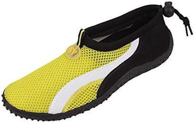 The ultimate in comfort aquatic/beach slip-on. Great for wear around the pool, beach, river or waterpark. Rubber sole provides great traction and support as well as protects from rocks, trash, and any other waste that can be encountered in the water. The mesh upper lining allows for quick water flow and draining as well as drying. Adjustable stretch cuff allows for a comfortable fit without the worry of them coming off. Offered in different colors in both men and women sizes so you can select your favorite and stay stylish.