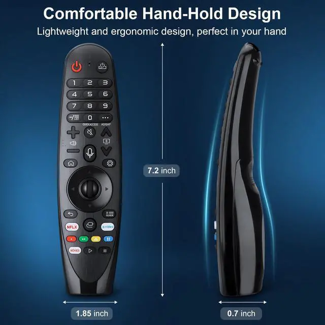 CompatibilityCompatible with OLED UHD NanoCell 4K 8K Webos Smart TV Models: ZX, WX, GX, CX, BX, W9, E9, C9, B9, NANO99, NANO97, NANO95, NANO91, NANO90, NANO86, NANO81, NANO80, SM99, SM95, SM90, SM86, SM81, UN85, UN81, UN80 UN74, UN73, UN71, UM80, UM75, UM73, UM71, UM6970 series. It also can be replacement for AN-MR18BA, AN-MR19BA, AN-MR20GA,AN-MR21GA,MR22GN,MR22GA,MR23GN,MR23GA,MR24GN magic remote.Please note that this remote isn't compatible with AKB75095307 AN-MR500 AKB73615306