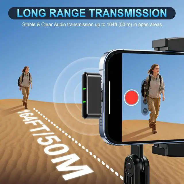 Stable, Low-Latency TransmissionReliable range for outdoor shoots and stage use (tested beyond 30 m; open-area reach ~50 m / 164 ft). Ideal for vlogging, teaching, live streaming, and performances.