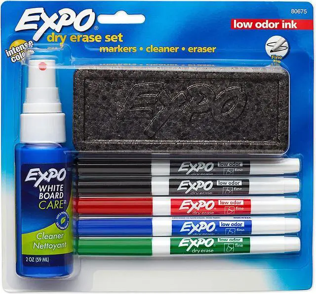 Bright, vivid, nontoxic ink is quick drying, smear-proof, easy to see from a distance, and provides consistent color quality. Durable, fine point marker tips produce thin, detailed lines that erase cleanly and easily with a dry cloth or Expo eraser. Ink is specially formulated to be low odor. Perfect for use in classrooms, small offices, and homes. Made in the USA, Expo 2 low-odor dry erase marker set, 7-piece with whiteboard cleaner, assorted colors.