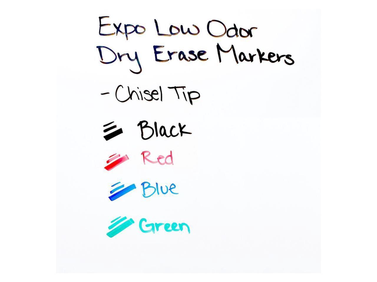 - Expo Low Odor Dry Erase Markers feature bold ink tha's easy to see from a distance and provides consistent color quality. These Expo dry erase markers erase cleanly and easily from whiteboards.
