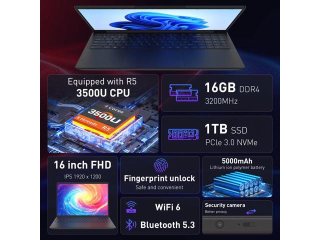 16inch AMD Ryzen 5 3500U Laptop, 16GB DDR4 RAM 1TB SSD, Window11 Pro, 1200 FHD IPS Display Laptop Computer, 4C 8T 3.7GHz, Backlit and Fingerprint, Professionals & Home Users,Black